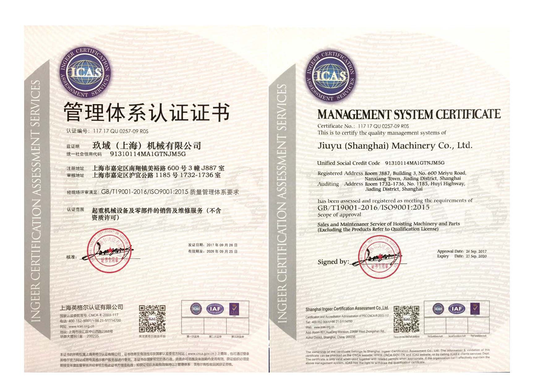 • 公司通過ISO9001:2015質(zhì)量體系認(rèn)證 公司于2017年9月26日順利通過英格爾認(rèn)證機(jī)構(gòu)ISO9001:2015質(zhì)量管理體系認(rèn)證!